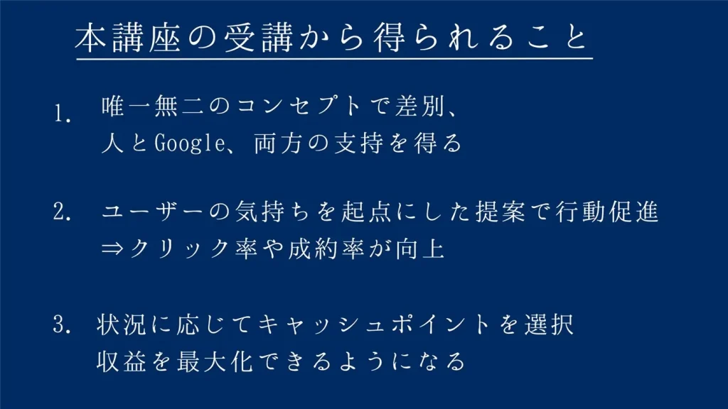『1PVの活かし方』は今集まっているアクセス(PV)を無駄にしないための施策をまとめた教材です。コンセプト作りやコンテンツ販売、SNSの話は扱っていません。